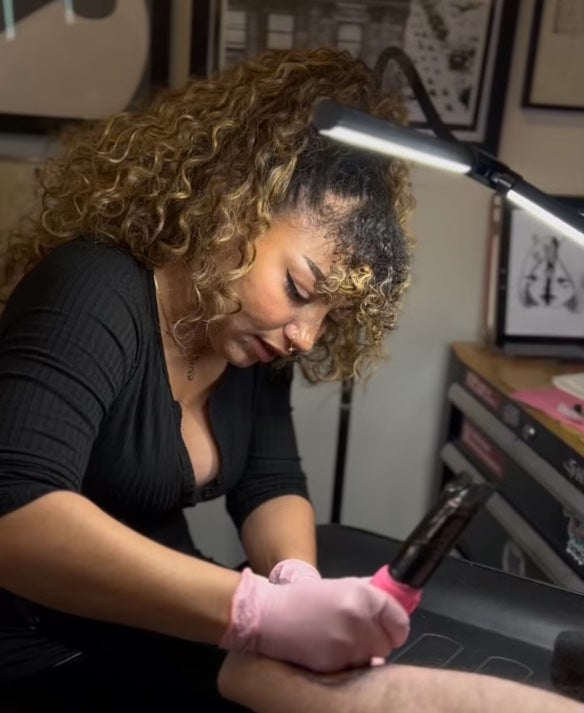 Taryn is a tattoo artist who brings bold designs, clean linework, and a deep respect for your story. Inspired by anime, animals, and horror films (with a playlist that jumps from K-pop to rap), her style is vibrant, intentional, and always evolving.